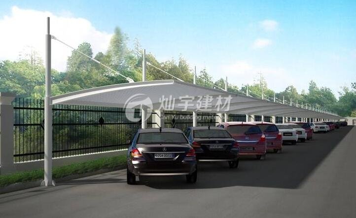 膜結(jié)構(gòu)停車(chē)棚所用膜材料由基布和涂層兩部分組成。膜結(jié)構(gòu)具有強(qiáng)度低、彈性大、易老化、徐變大、自潔性差,但價(jià)格便宜,容易加工制作,色彩豐富,抗折疊性能好等等特點(diǎn)。